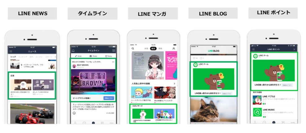 LINE広告はLINE内にあるタイムラインを始め、LINEニュース、ダウンロード数1900万を誇るLINEマンガ、LINEブログ、LINEポイントへの配信が可能です。